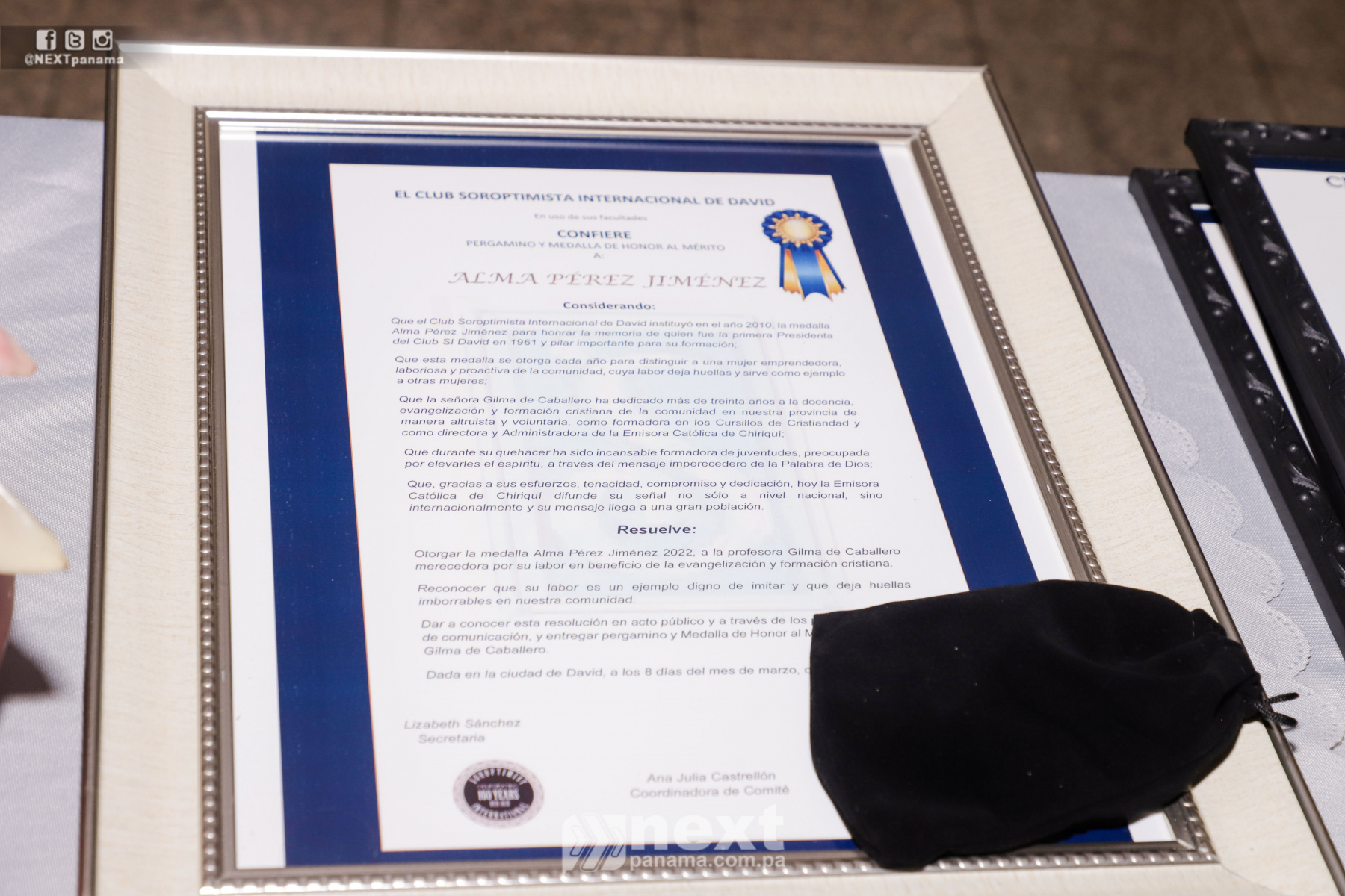 En el Marco de esta celebración de este día, se realizó entrega de la Medalla Alma Pérez a una dama de nuestras comunidades que haya realizado labores de altruismo en desarrollo de Chiriquí y el País. En esta ocasión un jurado eligió a la distinguida Señora Gilma de Caballero. Felicidades y gracias por sus aportes.